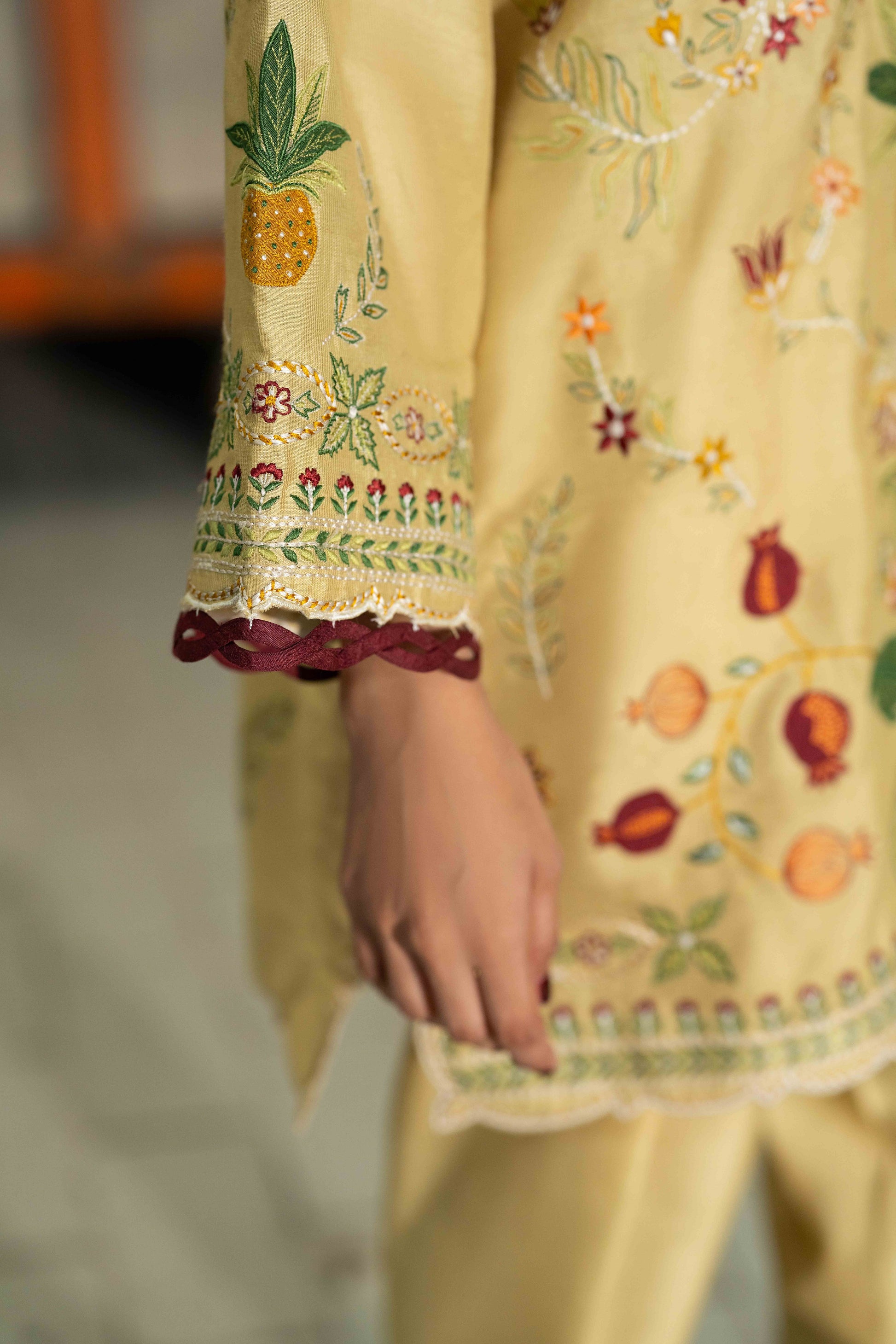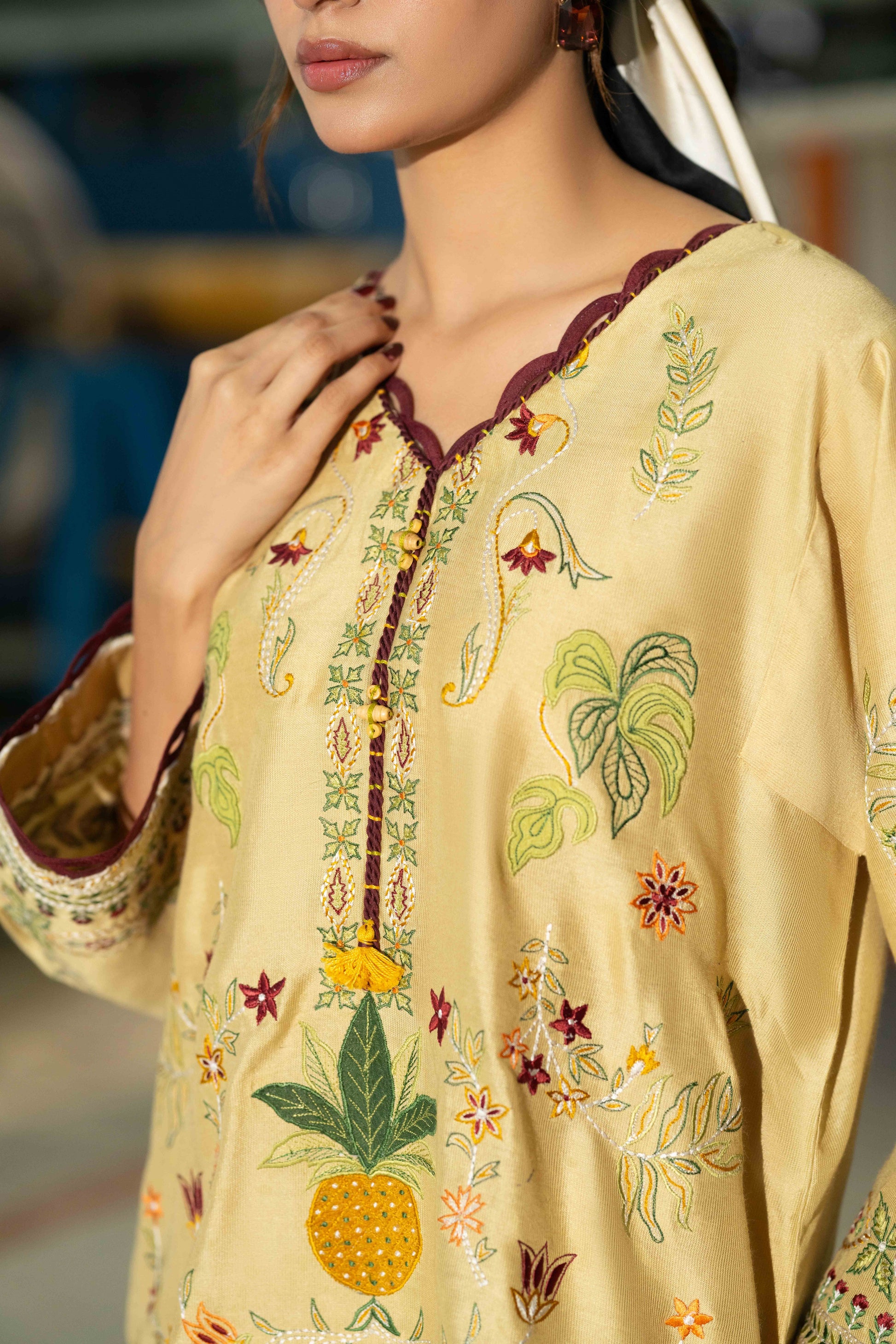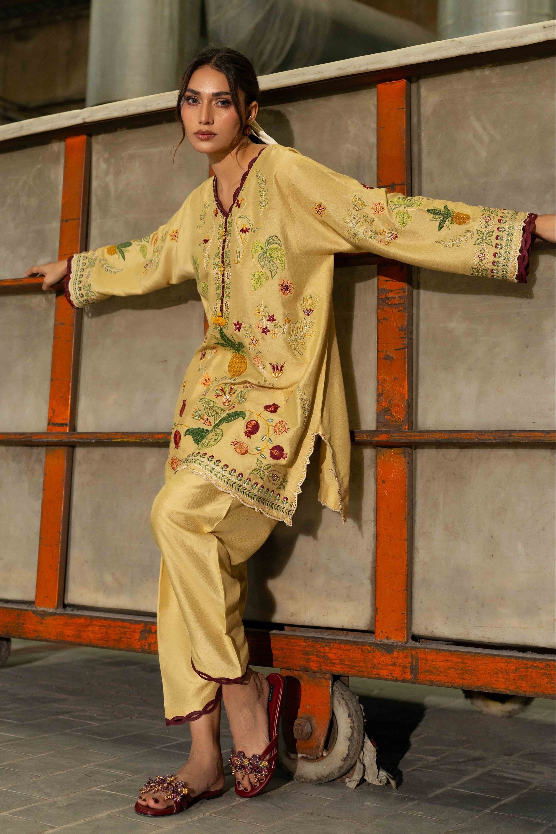 KEIRA- Crafted from breathable cotton spun fabric in a cheerful yellow shade, this two piece set features beautiful applique embroidery that brings texture and handcrafted detail to your wardrobe. The lightweight material ensures comfort throughout the day, while the artistic stitch work adds visual interest and personality.