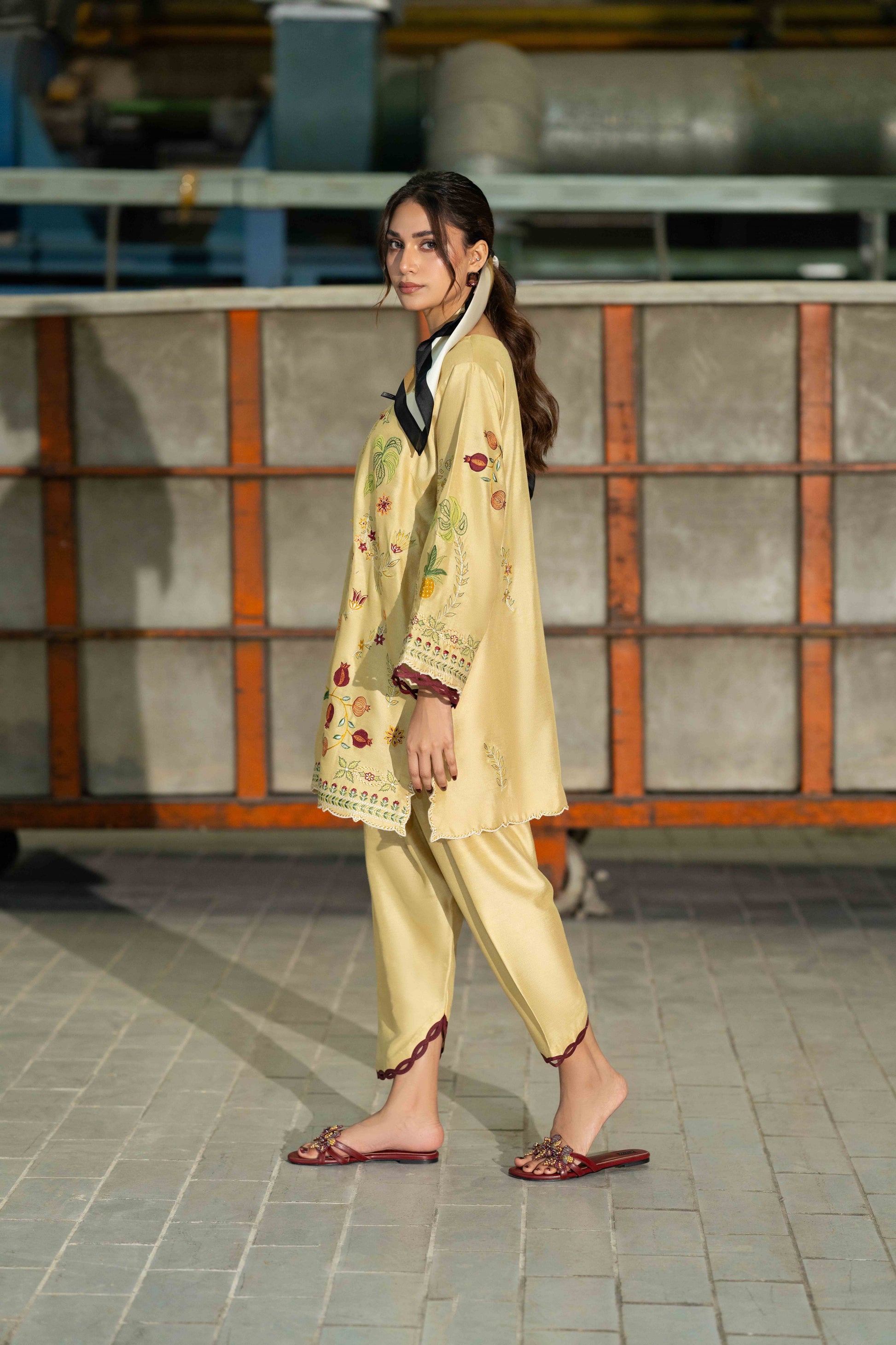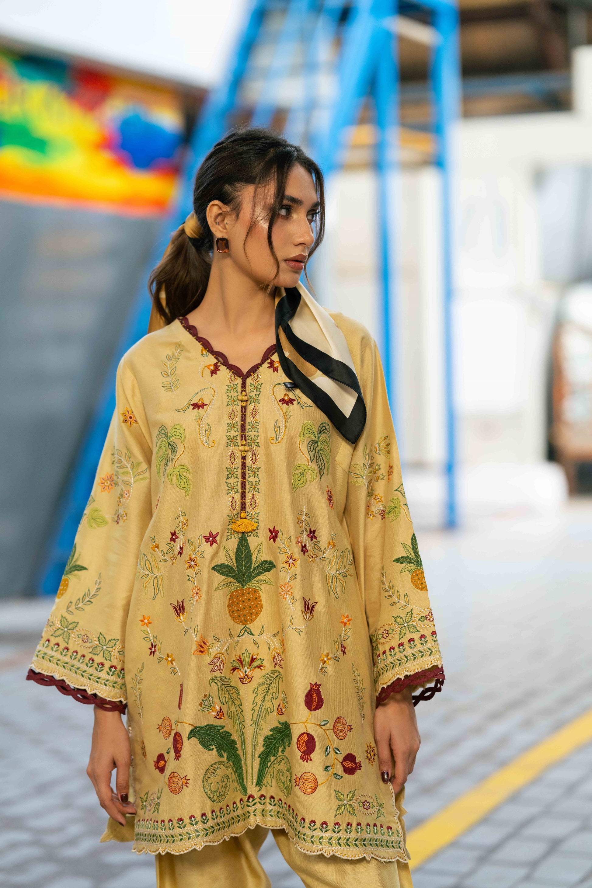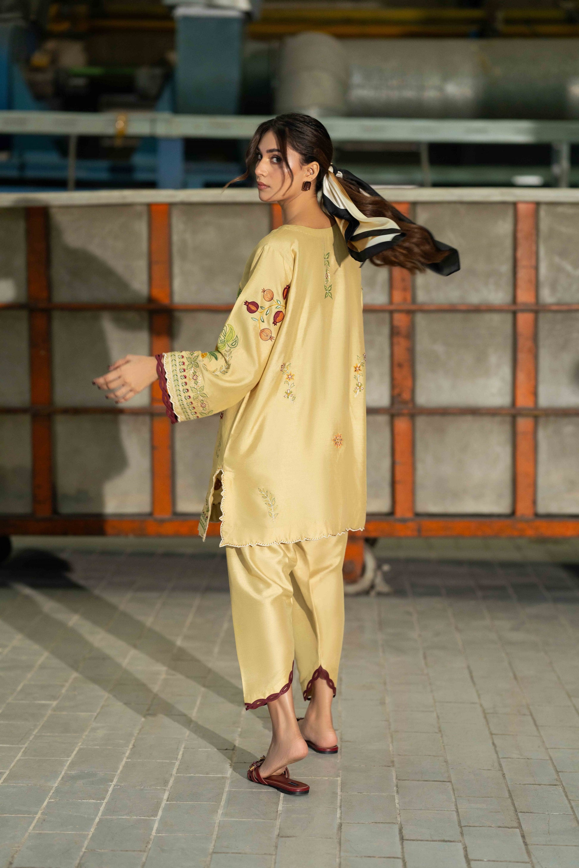 KEIRA- Crafted from breathable cotton spun fabric in a cheerful yellow shade, this two piece set features beautiful applique embroidery that brings texture and handcrafted detail to your wardrobe. The lightweight material ensures comfort throughout the day, while the artistic stitch work adds visual interest and personality.