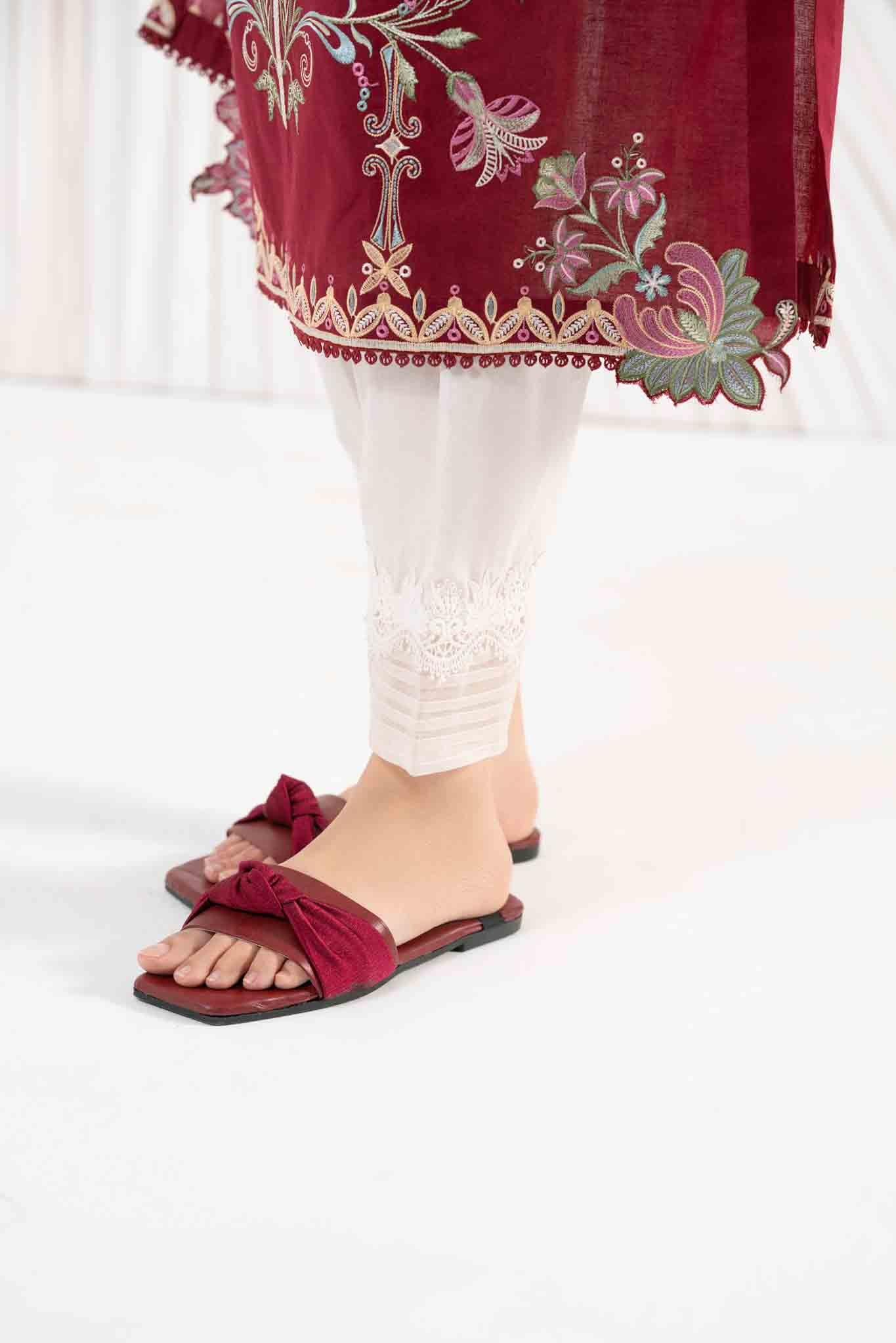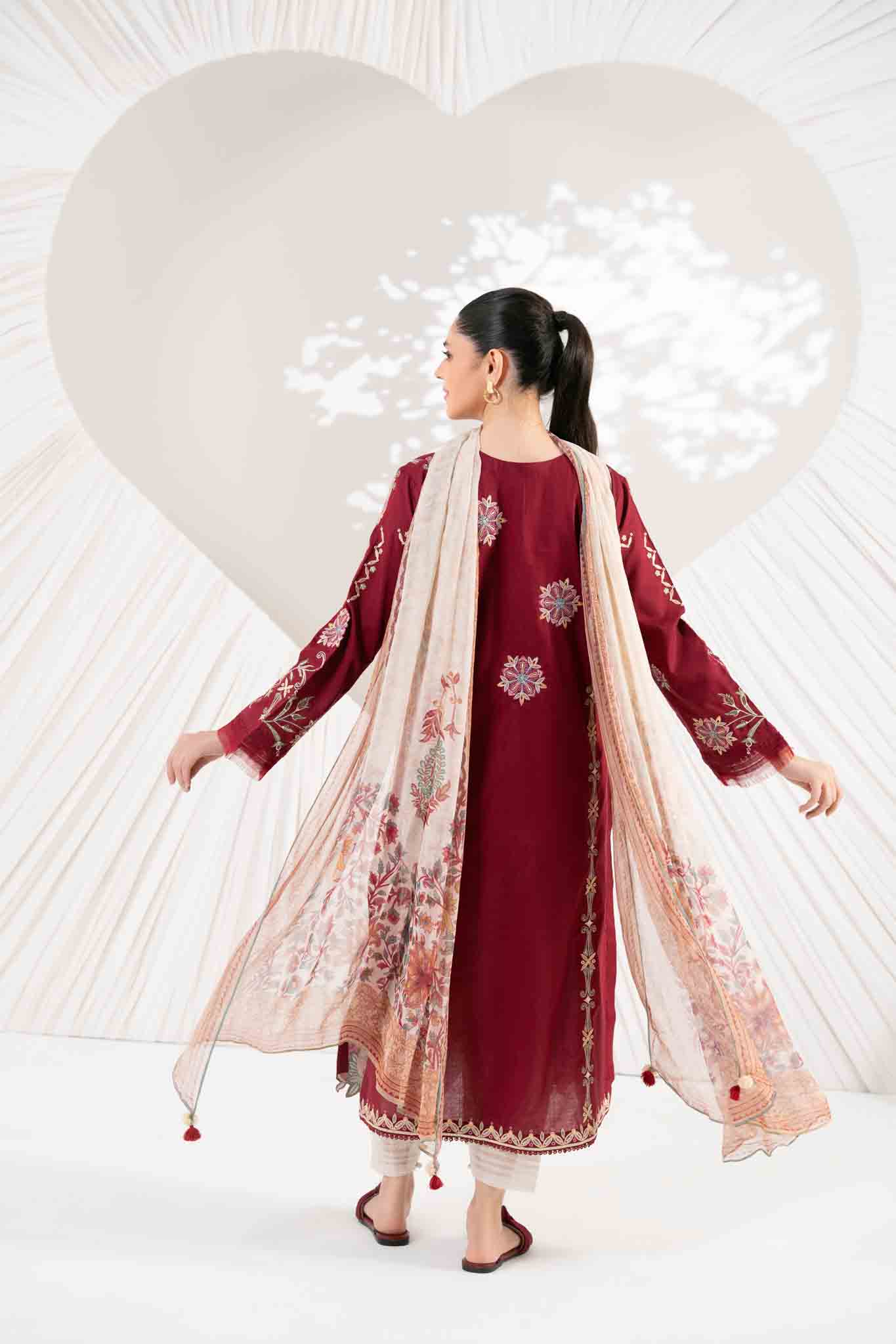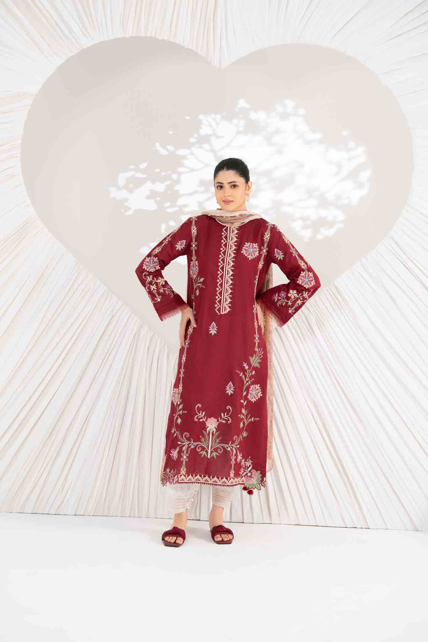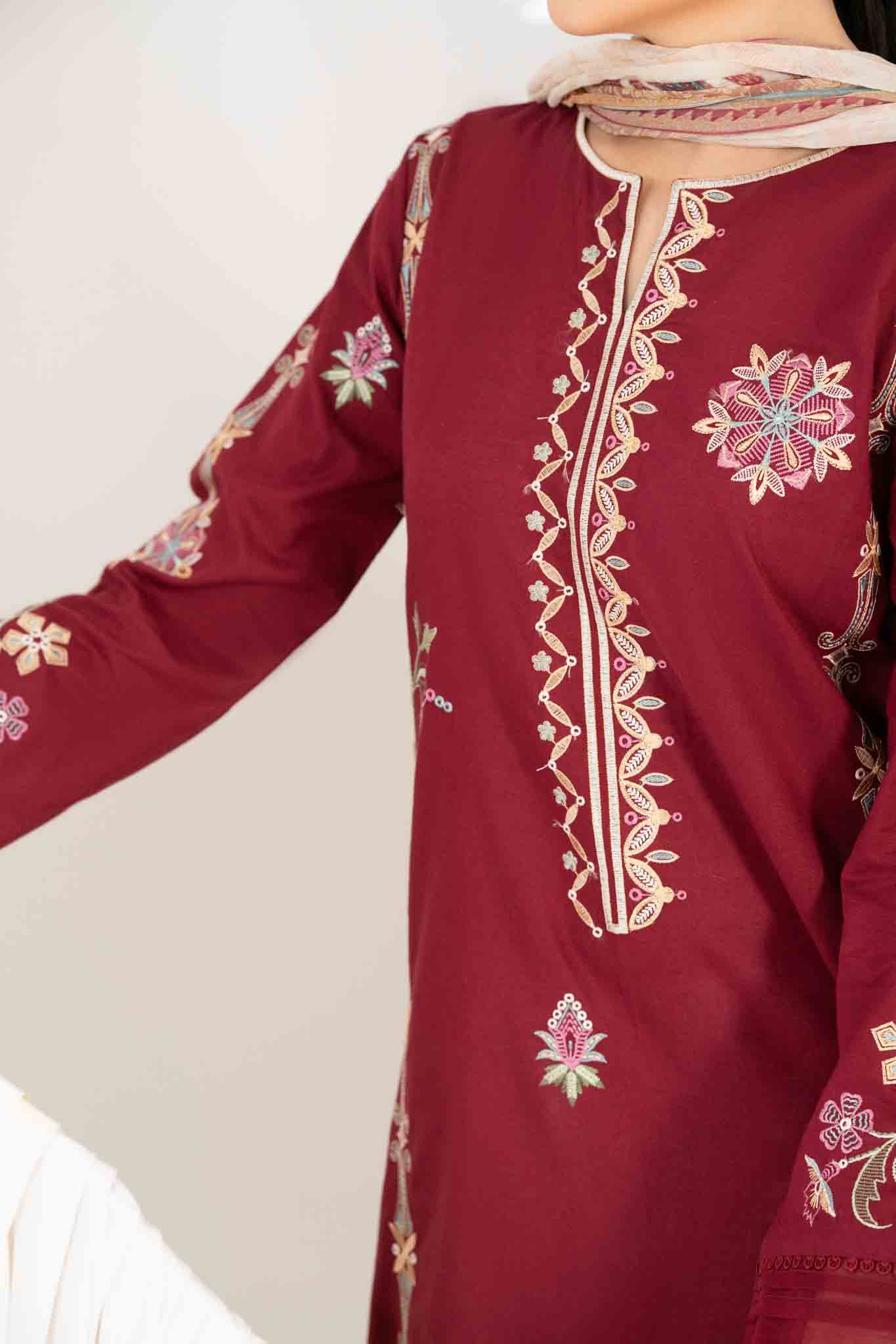 AMIRA- The New Power Color. Dive into rich Maroon with this stunning Cambric 2-piece set. The delicate embroidery on the shirt and dupatta adds an artisanal touch. Your ultimate statement look for any occasion.