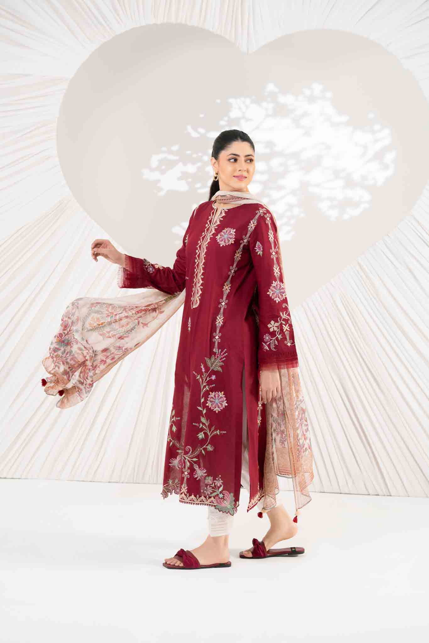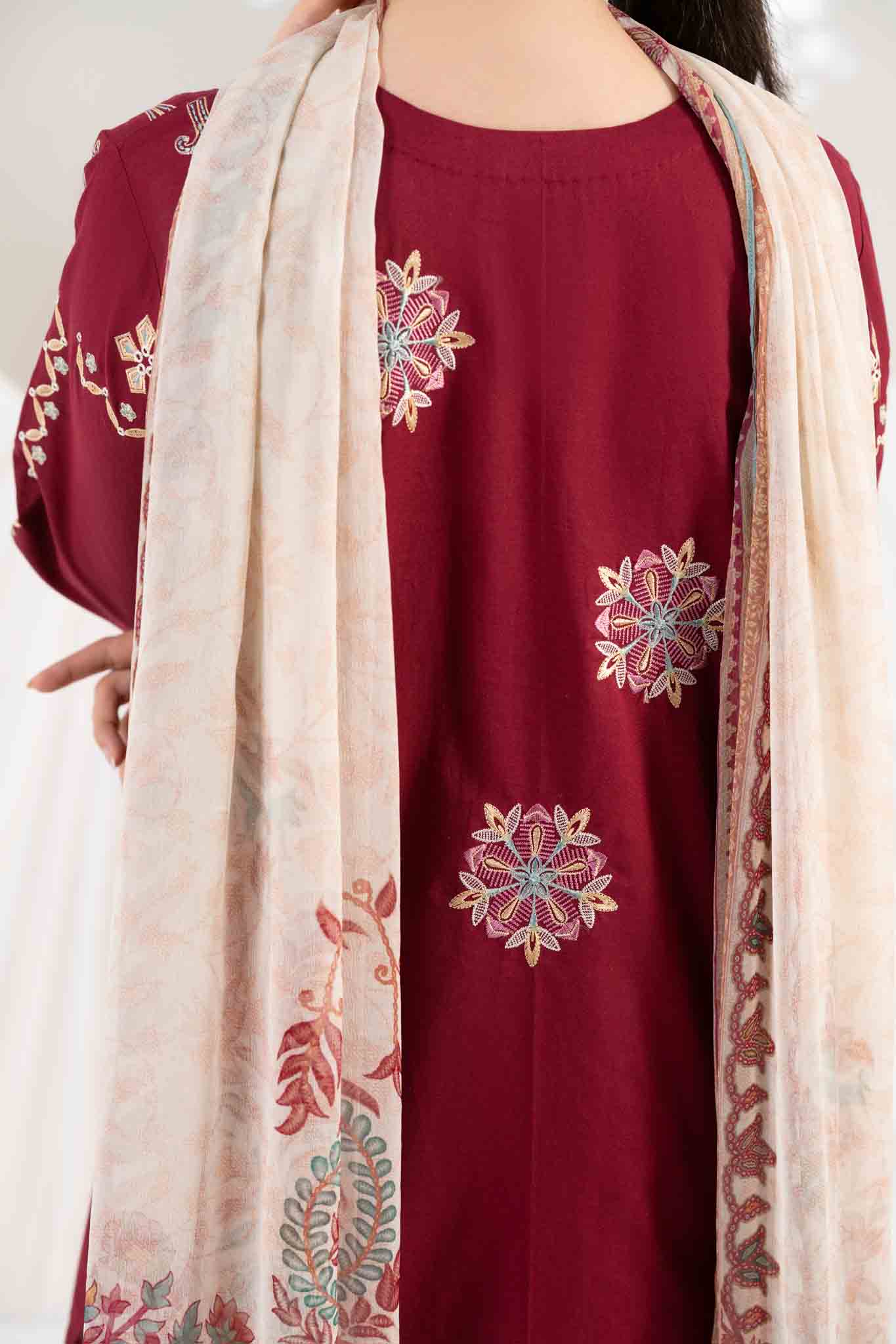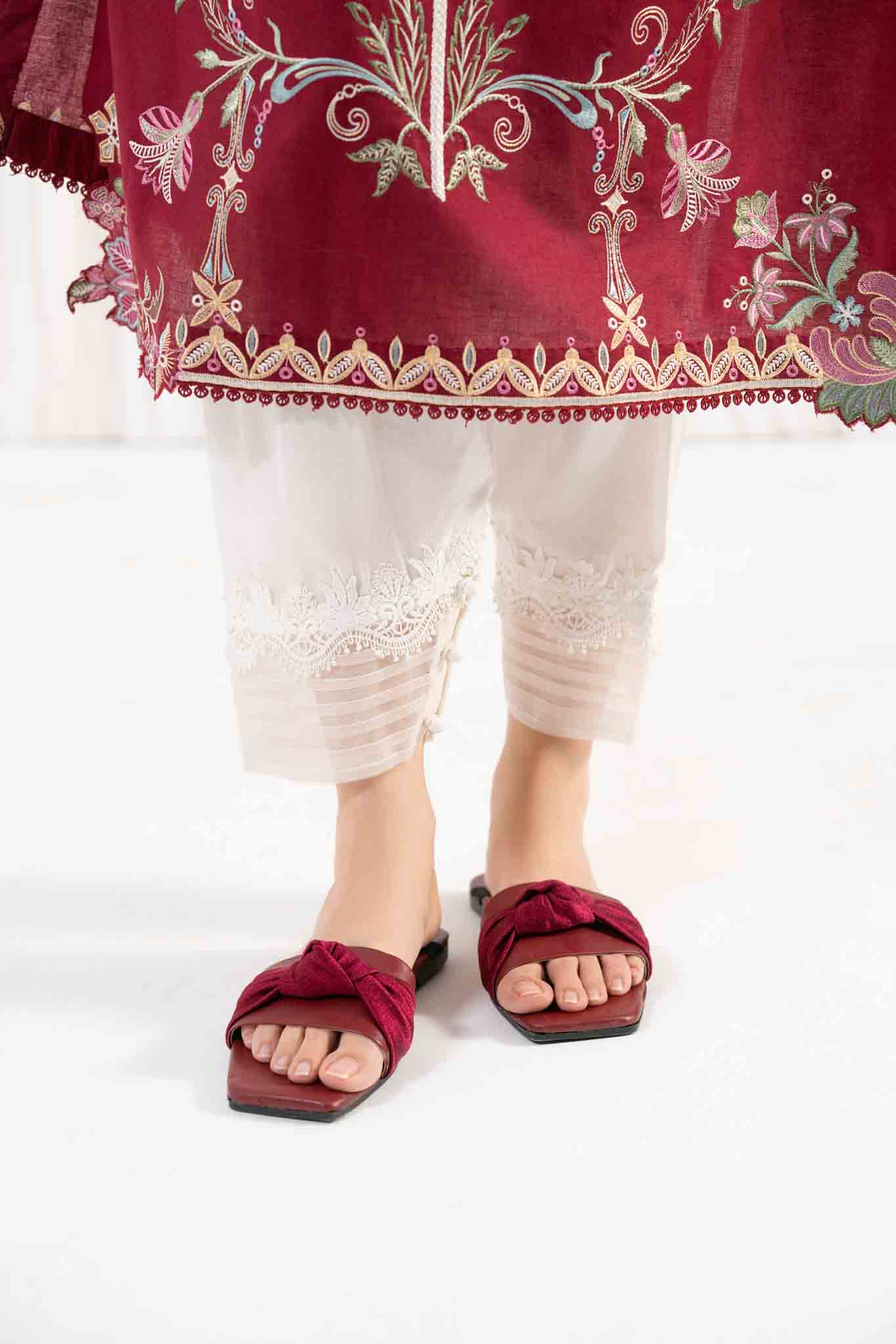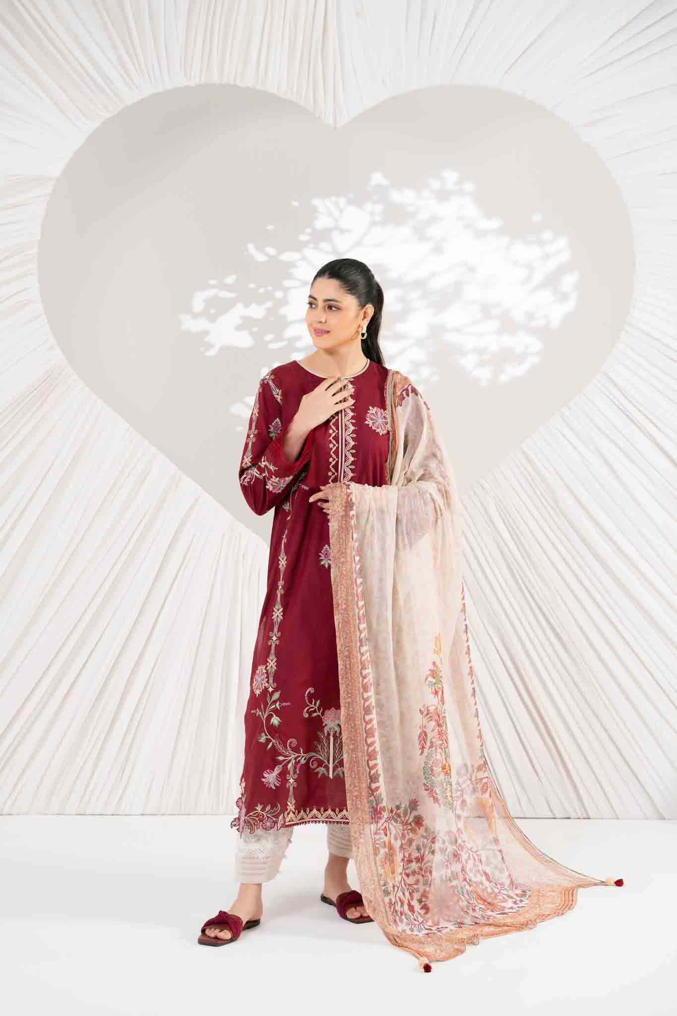 AMIRA- The New Power Color. Dive into rich Maroon with this stunning Cambric 2-piece set. The delicate embroidery on the shirt and dupatta adds an artisanal touch. Your ultimate statement look for any occasion.