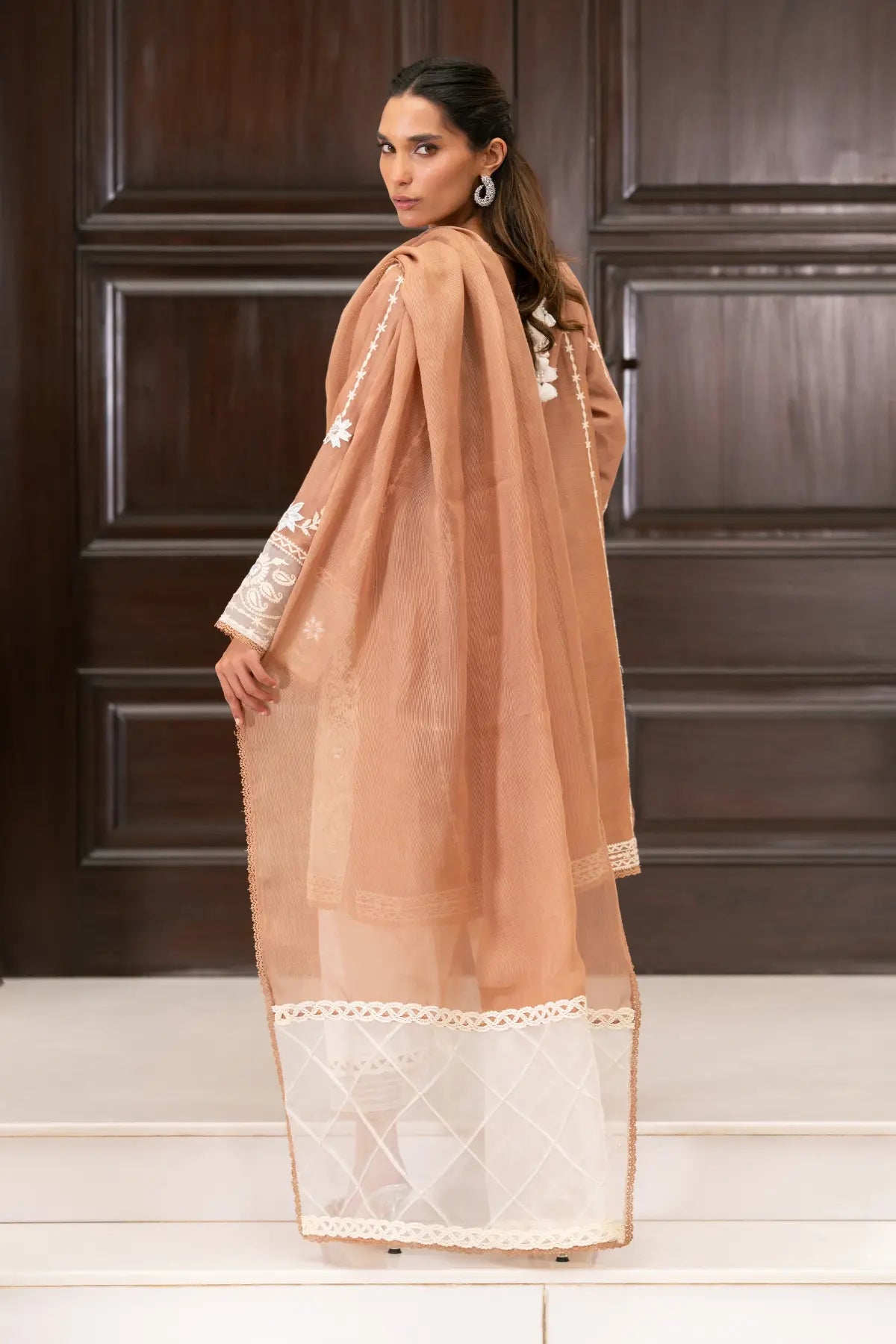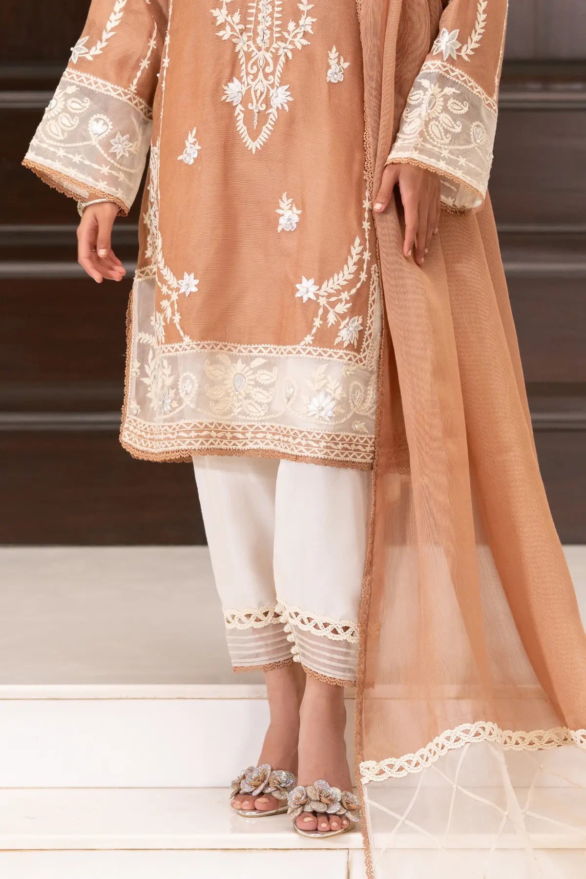 AURIE -Deep Caramel Brown sets the tone for this textured festive look. The intricate Aari embroidery is further elevated by hand-applied embellishments, creating a rich, shimmering effect against the warm, earthy base. Featuring a structured fit and a linear stripe dupatta, this ensemble balances detailed craft with a sophisticated silhouette.