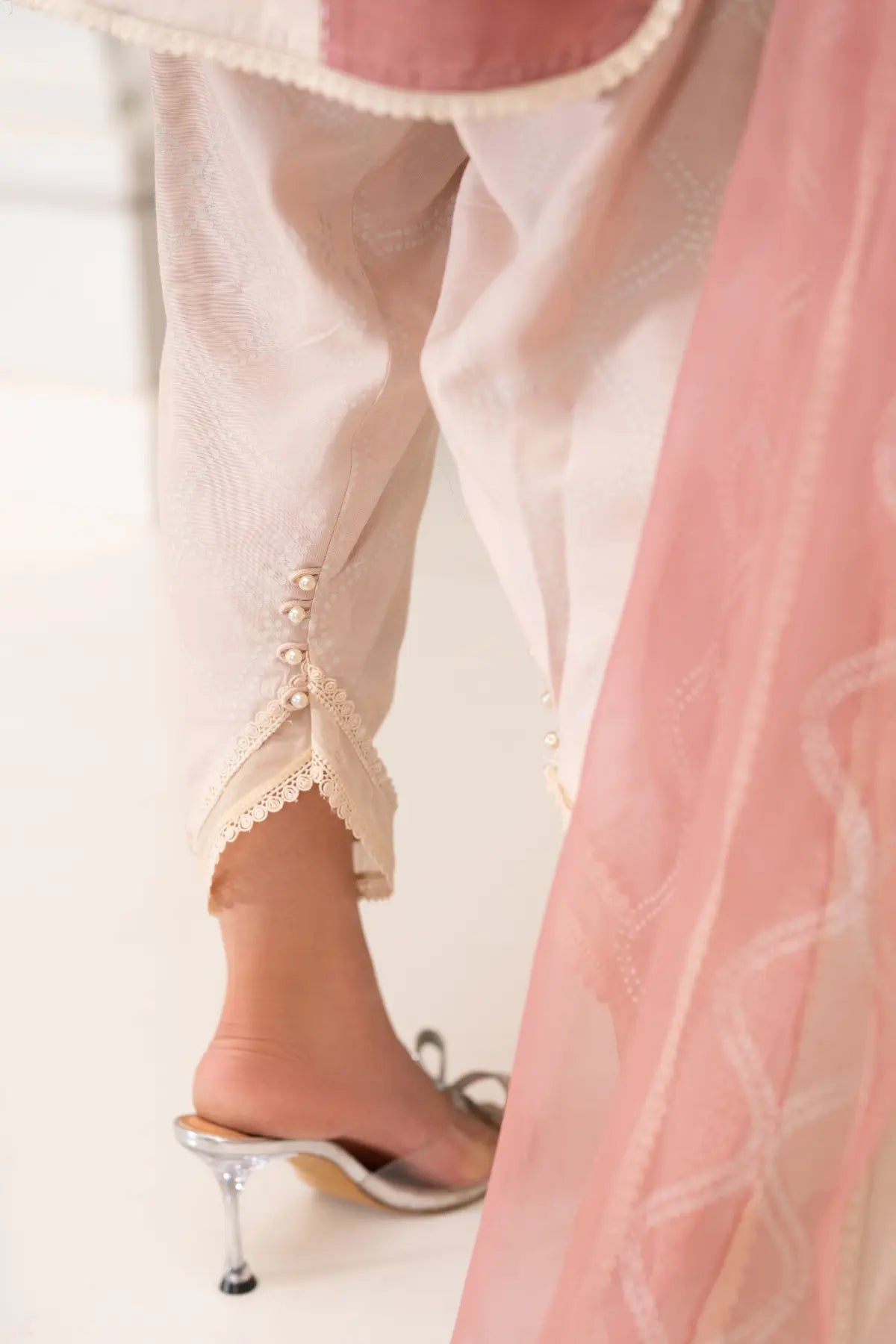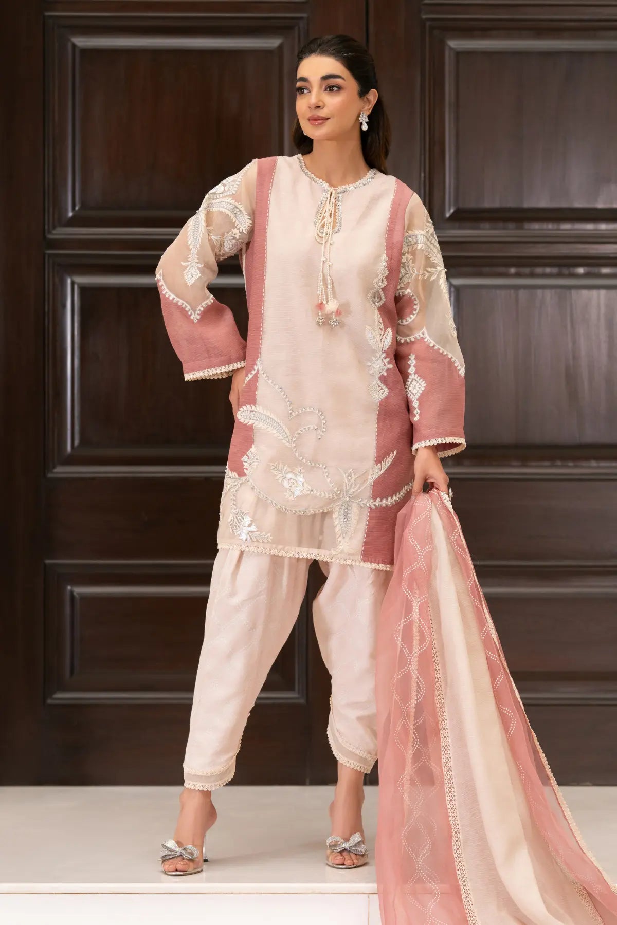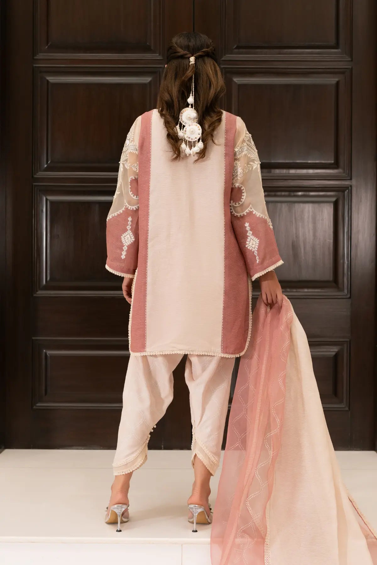 AVINA- Salmon Pink and Ivory merge to create a fresh, glowing palette for this festive ensemble. The look is defined by a multi-layered technique, featuring a precision Block Print base further elevated by intricate Aari Embroidery and shimmering Hand Embellishments. Paired with a delicate Pure Organza dupatta, this silhouette balances tonal softness with a high-impact, rich texture.