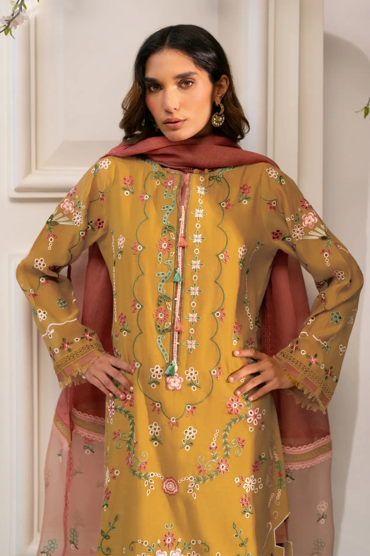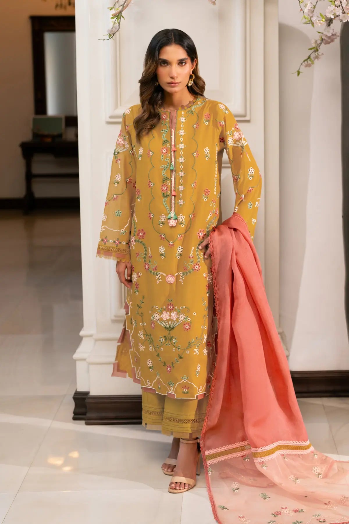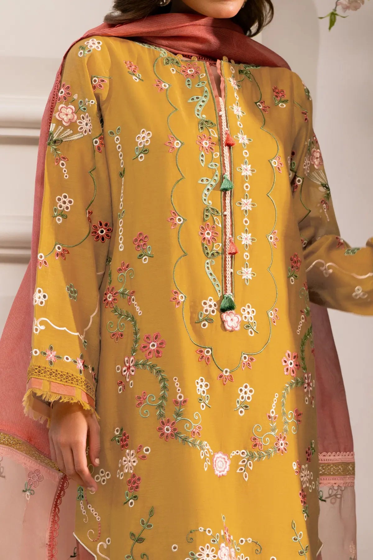NAHLA- Experience the calm of Dhaani Mist, a refreshing seasonal ensemble crafted in soft, muted green. This look pairs a Cora Cotton shirt—elevated by intricate fully boring embroidery with vibrant coral accents—with structured Khaadi Cotton bottoms. The masterpiece of the set is the pure stripe organza dupatta, featuring heavily embroidered borders seamlessly connected with delicate lace detailing. By blending the matte finish of cotton with the translucent, linear play of organza.