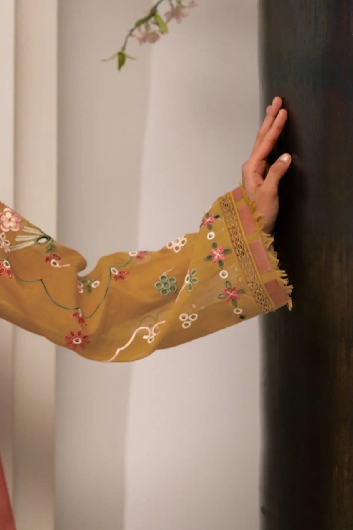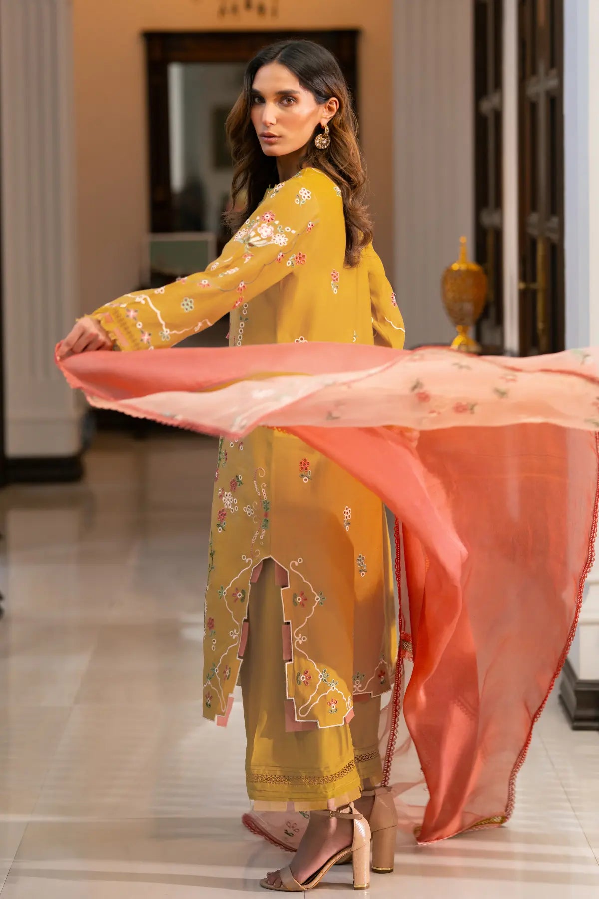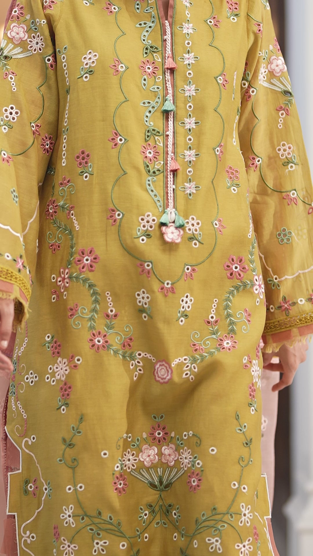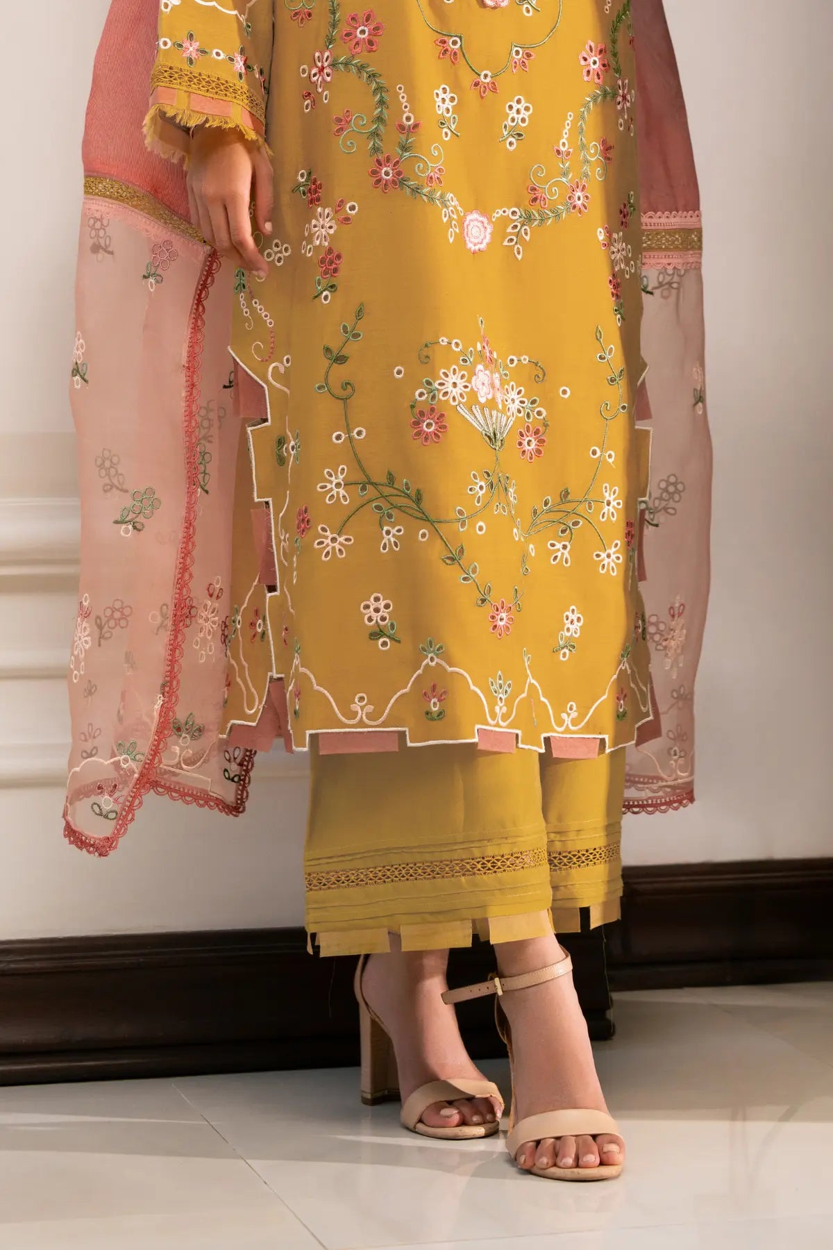 NAHLA- Experience the calm of Dhaani Mist, a refreshing seasonal ensemble crafted in soft, muted green. This look pairs a Cora Cotton shirt—elevated by intricate fully boring embroidery with vibrant coral accents—with structured Khaadi Cotton bottoms. The masterpiece of the set is the pure stripe organza dupatta, featuring heavily embroidered borders seamlessly connected with delicate lace detailing. By blending the matte finish of cotton with the translucent, linear play of organza.