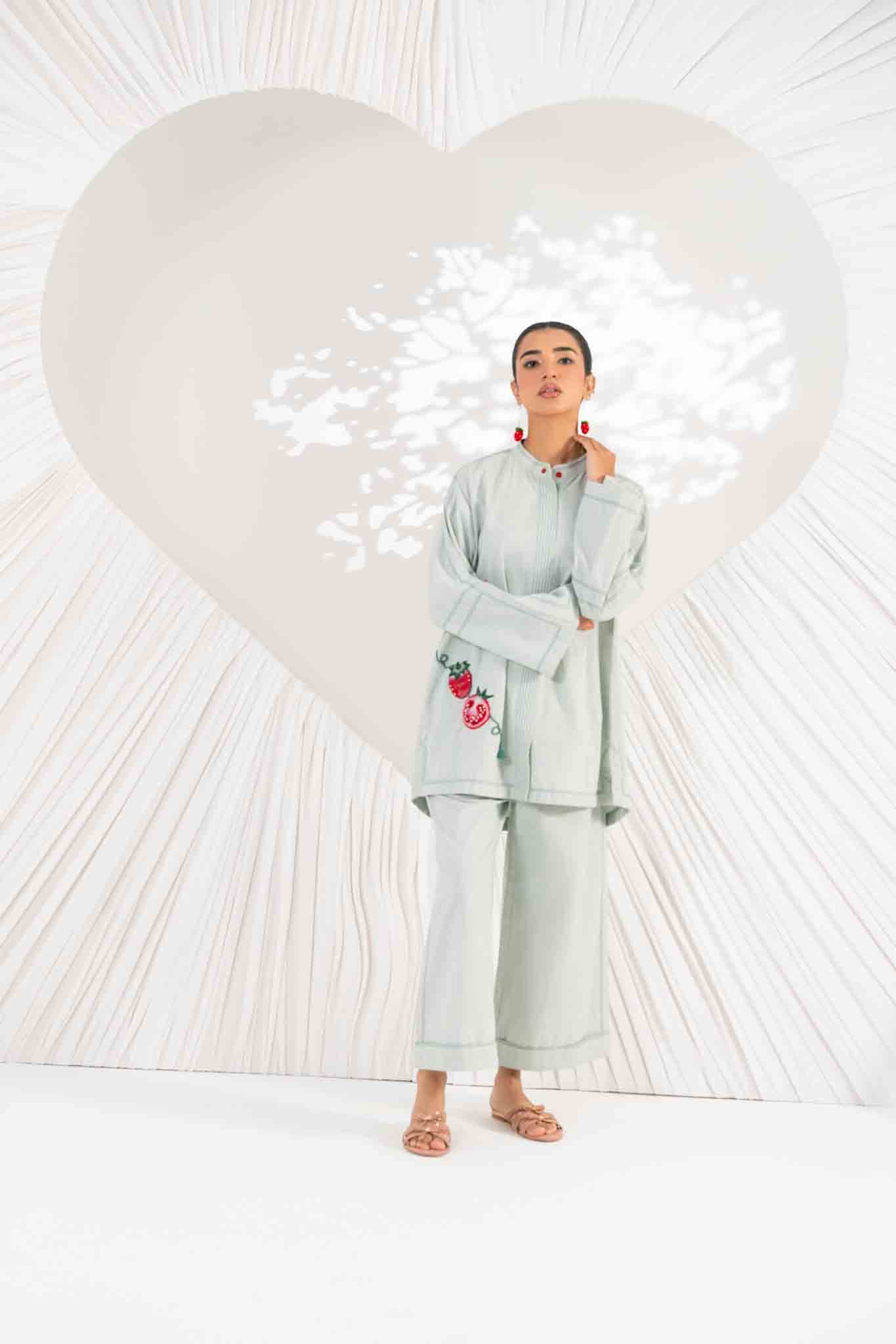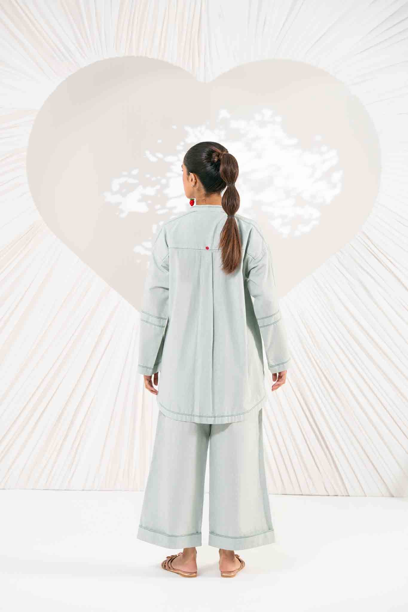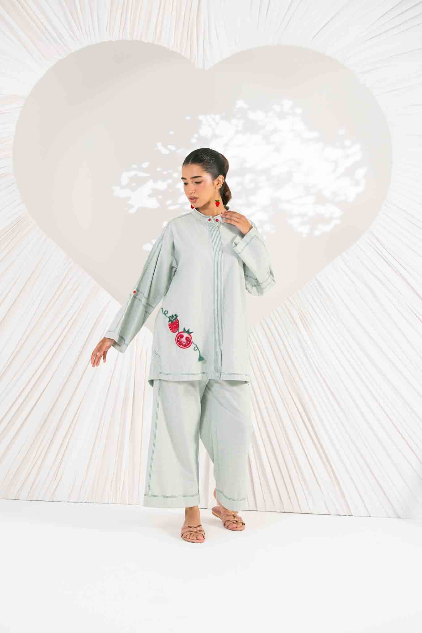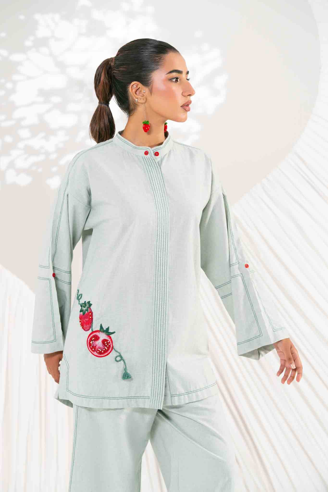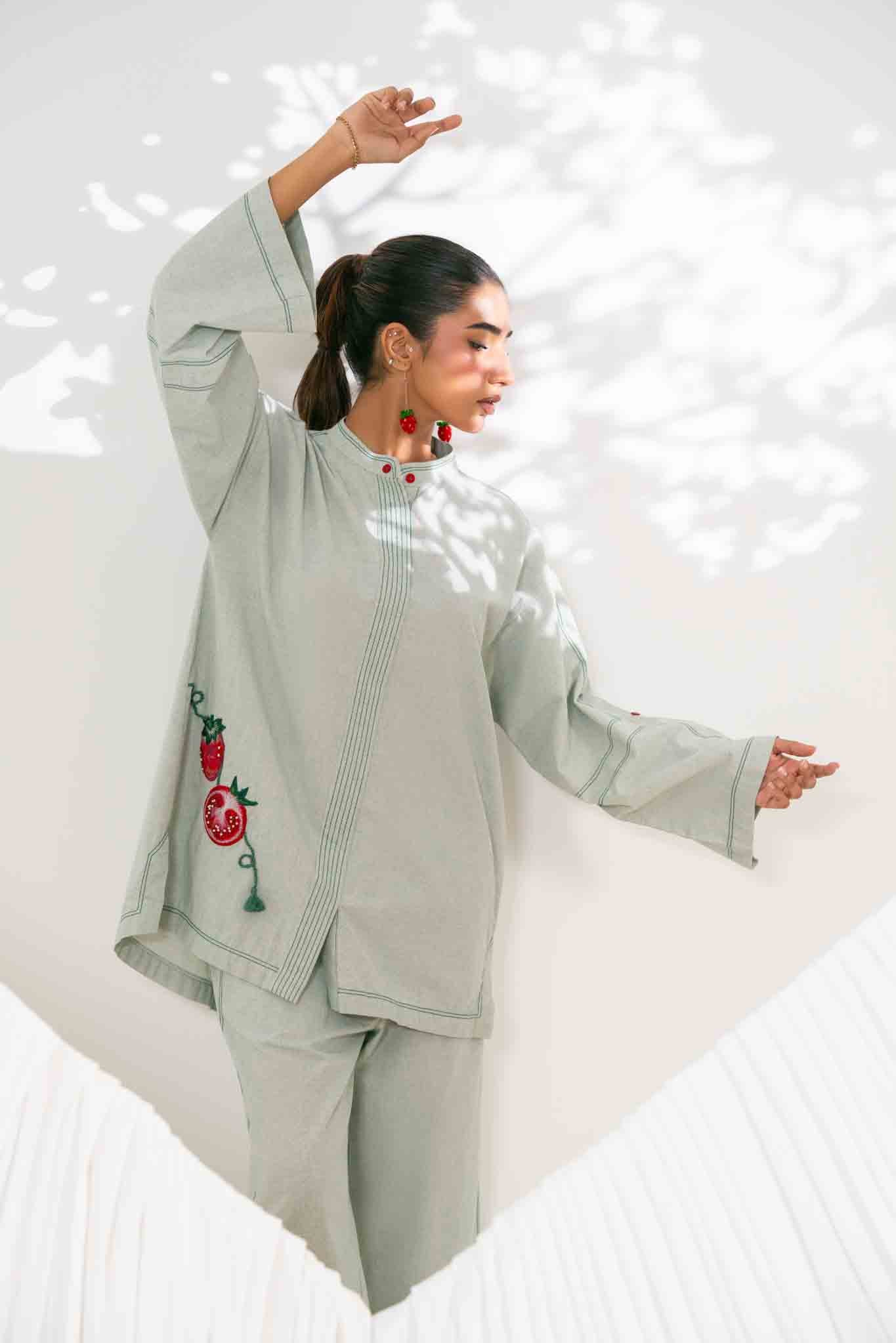 POMPY-Elevate your everyday look with the beautiful texture of Chambray and a unique pomegranate motif. This embroidered detail adds a fresh, modern twist to the serene Sage Green hue.
